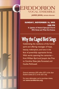 Tickets Join us for the start of our 2025-26 season! Why the Caged Bird Sings Five centuries of music celebrating the resilience of the human spirit, featuring works by Josquin, Byrd, Cecilia McDowall, Jake Runestad, Caroline Shaw, and Christopher Theofanidis. Sunday, November 16 at 3:00 p.m. St. Ignatius of Antioch West End Avenue at 87th Street in Manhattan Buy Tickets Check back later this season for tickets to the following performances: Sunday, March 1, 2026 at 3:00 p.m. Sunday, May 3, 2026 at 3:00 p.m. All concerts are at St. Ignatius of Antioch, West End Avenue at 87th Street in Manhattan.